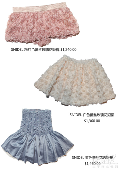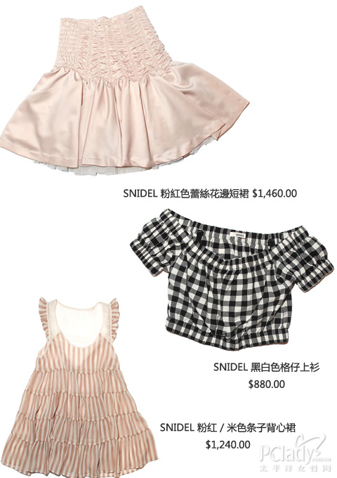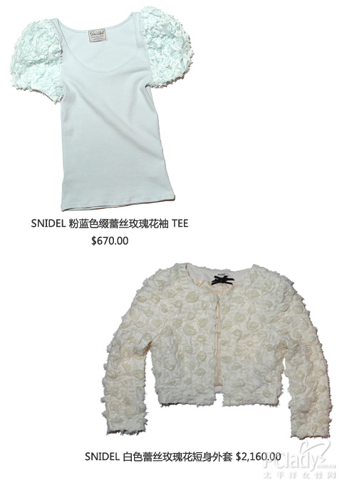 因此,snidel 的服饰总是充满了不同个性,能时而优雅之余,又可而活泼时尚。至于在最近的新品中,笔者对其缀有蕾丝玫瑰花饰的衣物特别钟情,能为女生添上一份高贵气质外,又能展现出女生可爱的感觉;此外,其他衣物也以lace 及chiffon 为主物料,同样要营造出少女性感柔情的一面。