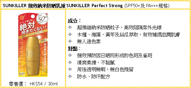 日本大型美容集团伊势半旗下防晒品牌SUNKILLER於今个盛夏推出新包装新配方的5款防晒產品。全系列均由日本製造再空运到港,加入多种滋润成分,去除一般防晒用品难闻气味,质地更清爽柔滑,高效保护,绝对是高质素的產品,而且用后感觉清爽不黏腻。