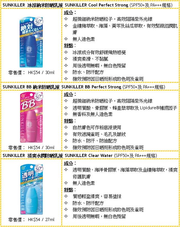 除此以外,SUNKILLER亦推出其他產品迎合不同人士的喜好和肤质。「冰凉纳米防晒乳液」蕴含冰凉成分,有效舒缓炽热感觉;「BB纳米防晒乳液」调教出自然肤色,可作粉底液使用,有效遮掩雀斑、毛孔及皱纹;「清爽水润防晒乳液」蕴含多种水润修护成分,防晒同时滋润肌肤。