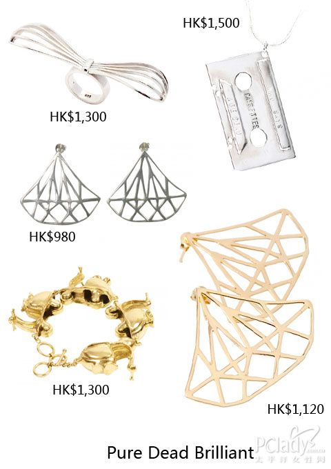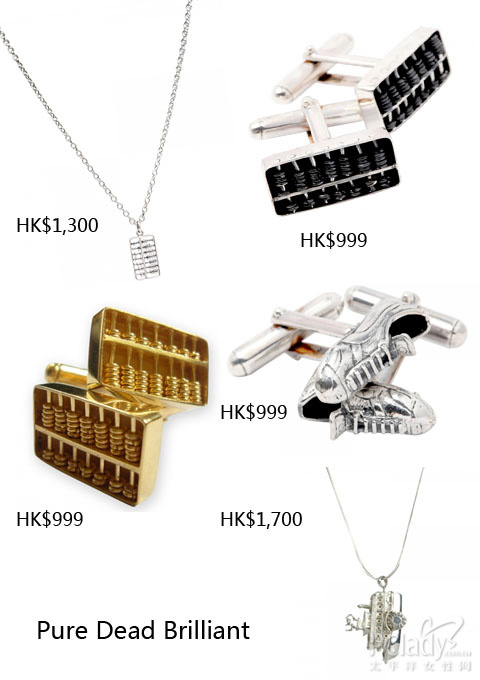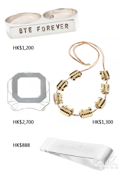 品牌配饰备有富中国色彩的算盘吊坠、伦敦巴士项链及带有纽约街头风格的钻石耳环。系列以金、银及铜的原料,不易煺色,价钱约HK$1000,绝对你我也afford 得起。