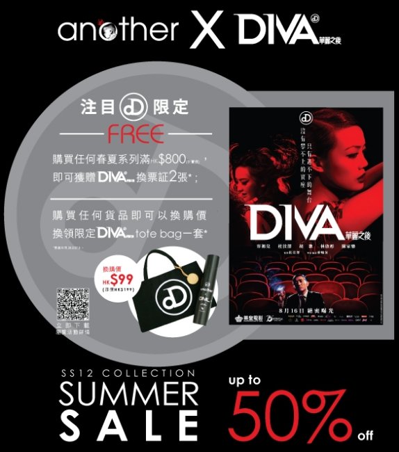 粉丝们是否很想知道购买方法呢?等小记立即告诉你啦!於7月19日起就可以在another店内以别注价$199购买tote bag套装啦!又或者於店内购买任何產品,即可以优惠价$99换领!其实优惠又怎只那麼少,凡所有客人只需购物满折实价$800,更可获<DIVA华丽之后>换票証2张,数量有限,售完即止!适逢another开始夏季减价时段,所有货品低至5折,大家準备银蛋大量入货了吗?