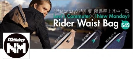 今个星期5出版的《新Monday》随特别版有Levi's Commuter单车袋waist bag,3个色,有黑、蓝unwashed牛仔布,还有超型卡其布,全部用上加厚料,劲耐用!配有防水拉链,面料亦可防水,去outdoor活动用都不用怕,下雨被淋湿了身里面的物品也不被淋湿! 袋身车有反光物料,岩晒夜晚踩单车用!最正的是有Levi's经典红旗仔label,牛迷必buy!每款连书只卖$45,请各位支持!