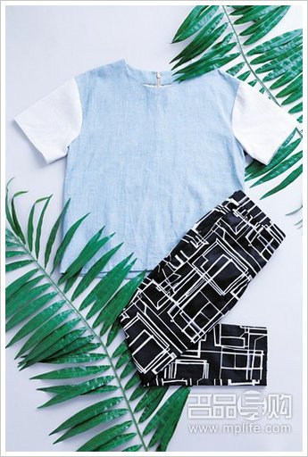 浅蓝色短袖上衣 $590 黑色格纹图案七分裤 $690