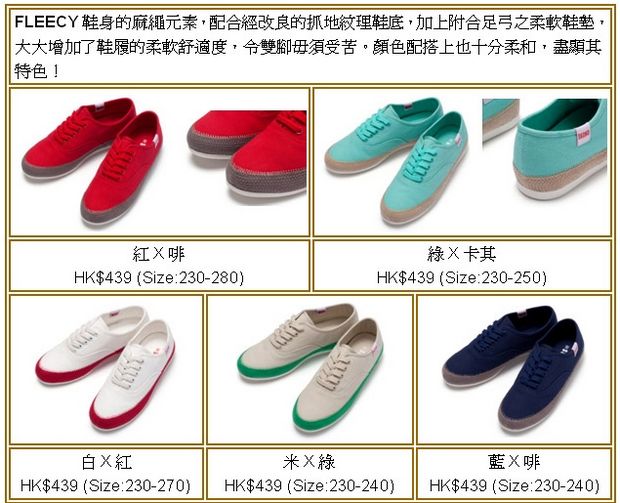 从FLEECY可见,Espadrille的麻绳元素及旧物风格都得以保留。麻绳变成了FLEECY鞋身细节,是為「二次创作」,散发阵阵北欧式简约自然美。而鞋底则改成抓地纹理鞋底,改善了粗硬、缺伸展力等缺点。另外,FLEECY加上了附合足弓之柔软鞋垫,令双脚毋须受苦,整双鞋形亦更见平衡,看上去不再那麼扁平,令穿著者减少粗鲁戾气,增添休閒美感。
