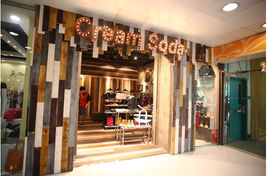 新店以近期流行的美式风格為主题,大部份家俱以经旧化处理的实木所製。新店开张,CreamSoda於货品上亦作出配合,一系列夏日新品上场,最著目的当 是CreamSoda的鞋款。最新推出的canves silp on,保持CreamSoda一贯的自信风格,吋半厚底以外,配合极厚鞋垫,有增高鞋垫之效果。鞋款以外,上下著装亦一拼到店,特别推介CdG系大人感之 patchwork shirt,衫袋与衫脚两侧之补强皆以花布拼合,有迷彩与腰果花供选,同系列尚有长/短chinos,要衬一套,其实不难。