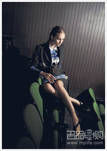 Dries Van Noten蓝白印花丝质恤衫$7700、黑色缀蓝白印花半截裙$7700、黑色缀蓝白印花大衣$16,900、Marni金色高跟鞋$6200(陈淑安摄)