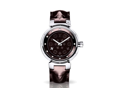 路易威登标志性的Tambour 腕表系列迷人新款 - 迷人的Tambour Disc 腕表,其深紫红色烤漆表盘饰以 Monogram 图案。 表盘8点钟位置及表耳外饰有镶钻 Monogram 花朵。