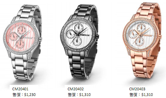 这一系列全新的Cosmopolitan 夏季女装腕表以水晶代替数字的刻度,以全施华洛世奇水晶围绕表壳造型,稳重而不失优雅。加上实用的三眼设计,分别显示日历、星期与小时,方便各位正在為事业衝刺的女性争分夺秒。系列分别有三种顏色选择:银色、黑色及玫瑰金色,当中银色腕表以俏皮清新的粉红色条纹表盘点缀,增添少女气息。