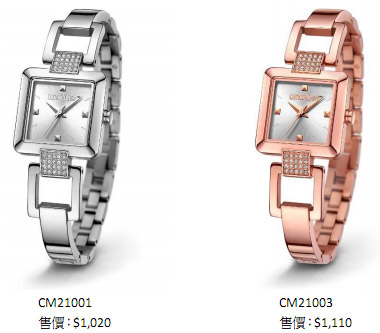这个系列的设计均以太阳纹盘面配方形表壳,表盘优雅简洁,与表壳两旁点缀的 20颗施华洛世奇水晶相映成趣。再加上半手鐲式水晶镶嵌的钢带,配备有亮面和玫瑰金色两款选择,突显质感与线条的和谐,简单又俐落大方。