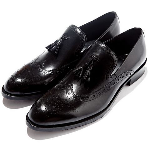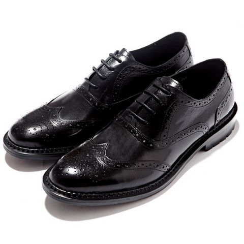 黑色wingtips鞋款上面加多个吊鐘设计,想试大热「啷啷」鞋,平玩之选。