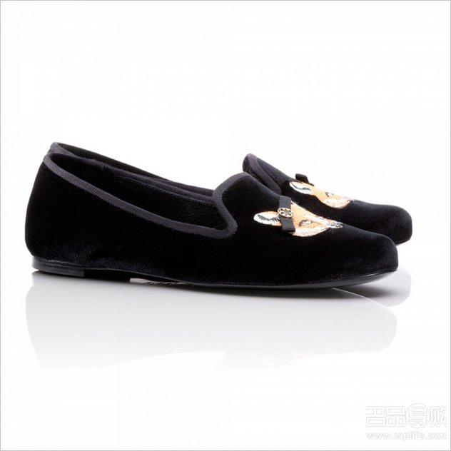 鞋履没有品牌标志性的圆形金属牌,换上彩色狐狸头装饰,戴上蝴蝶结的她,更觉可爱。