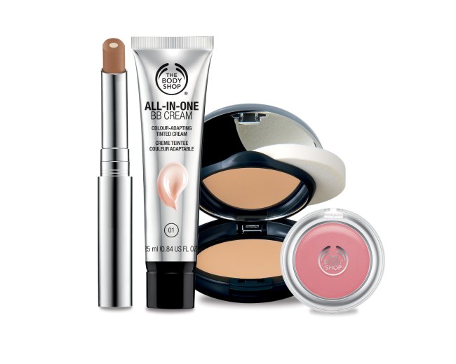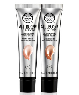 The Body Shop全新推出的All-In-One全效底妆系列,具自动调色功能,让你於最短时间内完成一个完美贴近肤色的底妆,呈现出最完美自然的肤质。当中All-In-One自然调色粉底霜 (All-in-One BB Cream),其珍珠白色的乳液於推开后会呈粉底色调,并能随个人肤色转变色调,与原来肌肤相衬,自然无瑕。同系列还有粉底、遮瑕膏及胭脂,四个简单步骤即可拥有自然肤色。