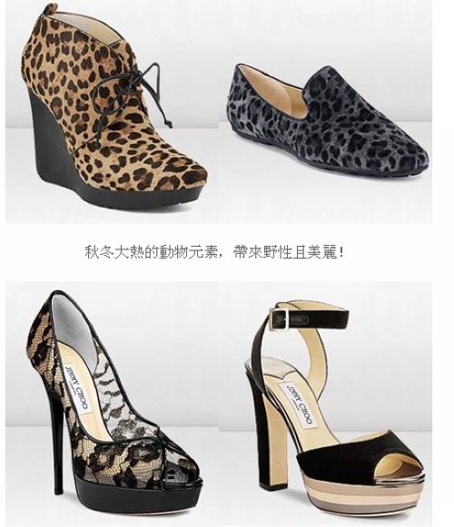深受外国女星和去世的戴安娜皇妃宠爱,甚至你同我都想拥有的一对鞋,那就是Jimmy Choo!雨过天晴后,凉风又起,秋日感觉渐浓,你為秋冬置装了没有?今日為大家精选多款Jimmy Choo 2012 秋冬系列的手袋和鞋履,尤其是闪亮的鞋根和Clutch 设计最适合出席PARTY或酒会。另外部份手袋及鞋履印有秋冬大热的animals元素,大家可以安坐公司或家中,选择你的至爱啦!