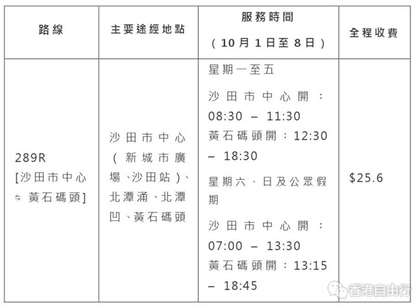 内地国庆黄金周明日(10月1日)开始,九巴预计万宜水库、西贡郊区等将继续成为游客必到景点之一,期间会加强多条往返西贡郊区的路线。其中路线289R「沙田市中心←→ 黄石码头 」将于10月1日至10月8日期间每日提供服务,经由罗湖口岸或福田口岸抵港的旅客,可于乘搭过境铁路到沙田站后,于邻近的沙田市中心巴士总站乘坐路线289R,只需约40分钟车程便直达北潭涌,继续前往黄石码头或接驳其他交通工具前往万宜水库东坝。