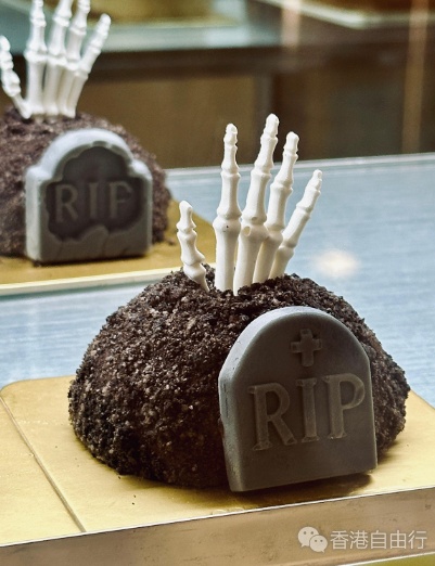 RIP 阴森墓地蛋糕:墓碑和白骨手全部由巧克力制成,外形惊悚吸睛,内层是伯爵茶慕斯与混合莓果酱,香气十足,大人小孩都爱不释口!