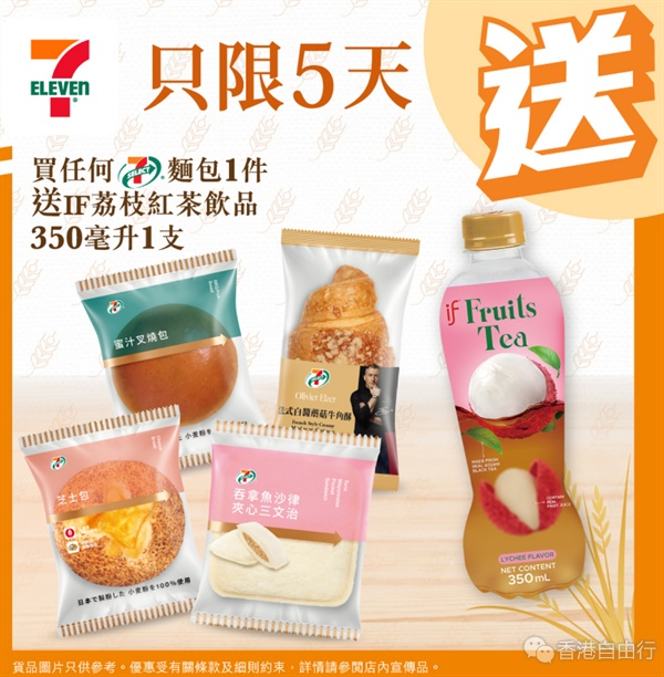 7仔早餐福利来喇,打工仔快快来扫货!即日(12日)起至1月16日,到7-Eleven购买任意一件7-SELECT麵包,即可获赠IF荔枝红茶饮品1支(350毫升)。每宗交易只限以优惠价换购饮品1件,部分货品只限于指定店舖提供。货品数量有限,售/送/换完即止。