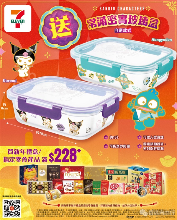 7-Eleven今年的新春购物优惠,率先送上新春优惠头炮,由2026年1月12日早上7时起,于7-Eleven分店,或7-Eleven流动应用程式「到店自取」购买新年礼盒或指定零食产品满228元,即送高质Sanrio characters限量版常满密实1L玻璃盒1件。除了新年礼盒,购买指定零食亦可以得到这精美赠品。赠品数量有限,送完即止。