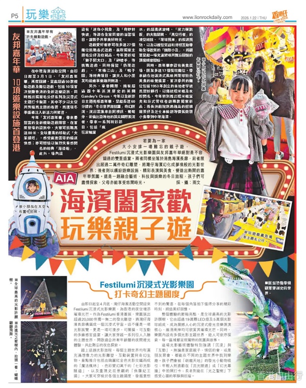 若要为一家大小安排一场难忘的亲子游,Festilumi沉浸式光影乐园与友邦嘉年华绝对是不容错过的双重盛宴。两者同样坐落于港岛海滨长廊,前者展出超过二万件奇幻雕塑,将湾仔海滨幻化成梦境般的光影世界;后者则以缤纷游乐设施、精彩表演与美食,营造出热闹的嘉年华氛围。这是一趟融合艺术、科技与娱乐的冬日旅程,孩子们可尽情探索,父母亦能享受悠閒时光。