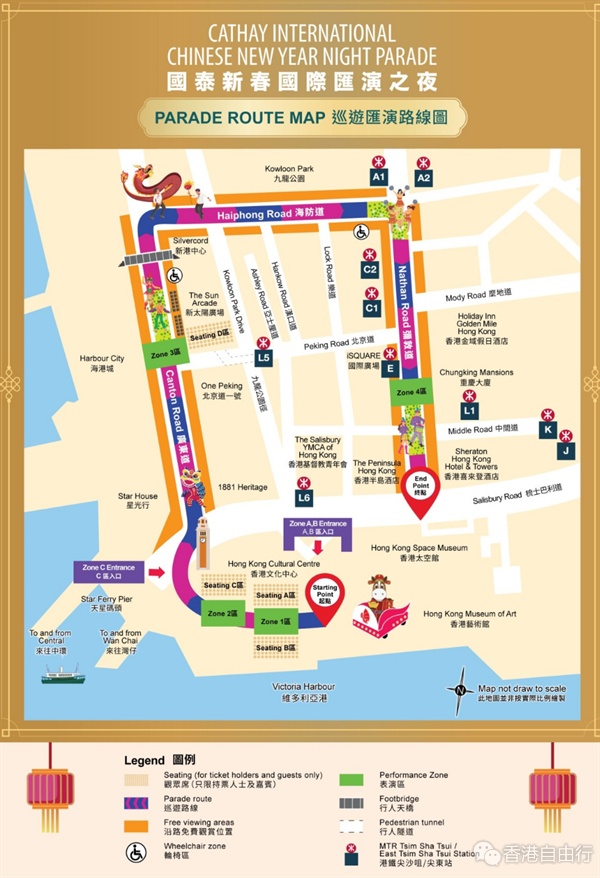 公众亦可在巡游路线(广东道、海防道及弥敦道)沿途的有利位置免费欣赏。