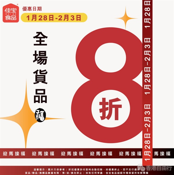 佳宝食品超级市场宣布推出极具诚意的「快闪优惠」,一连7日(1月28日至2月3日)举行全场8折大激减。