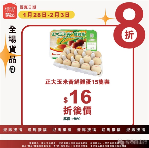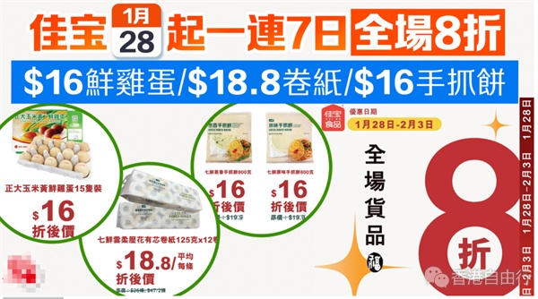 佳宝今起一连7日全场8折 $16鲜鸡蛋/$18.8卷纸/$16手抓饼