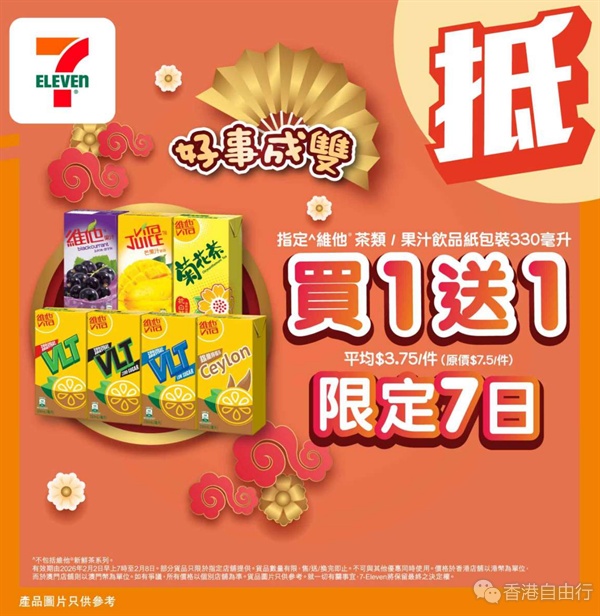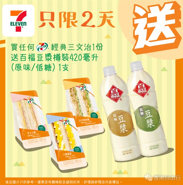 7仔又推限时优惠喇!即日(2月2日)起至2月8日,光顾7-Eleven购买指定维他茶类或果汁饮品纸包装330毫升,即享买一送一优惠。今明两日(2月2日至3日)购买任何7-SELECT经典三文治一份,即送百福豆浆樽装420毫升(原味/低糖)一支。抓住优惠,快快扫货吧!