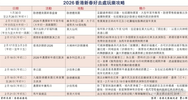 新春贺岁活动的重头戏,由旅发局以「开年 开运 开心」为主题的花车汇演率先打头阵。大年初一于尖沙咀上演的花车汇演将汇聚近60队来自全球十多个国家及地区的花车及表演队伍,多个单位属首次参与,包括香港麦当劳推出50周年复刻火车唤起集体回忆;香港品牌玩具协会邀来Labubu与Molly等本地潮流人气IP现身;以及林村许愿广场将象徵祝福的「发光许愿树」搬到花车上。适逢马年,旅发局则以「双花车」亮相,结合Q版马仔吉祥物与启德体育园模型设计,展现香港作为「盛事之都」的魅力。
