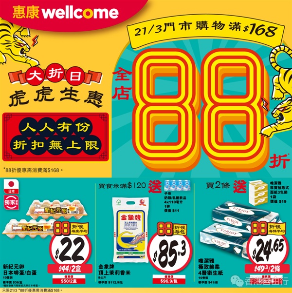 惠康「三月大节庆」三重惊喜陆续来!本周六(3月21日)全线惠康门市将推出一日限定「全场88折」快闪优惠,凡买满$168即享88折优惠,选购全线红酒及白酒满$300更可额外享85折优惠,无论是日常用品、新鲜食材,还是小酌一番都尽享坚抵折扣!