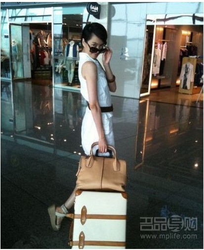 一身白色小洋装从机场出发,而最抢眼的绝对是白色旅行箱和上面的超大Tod's手袋。