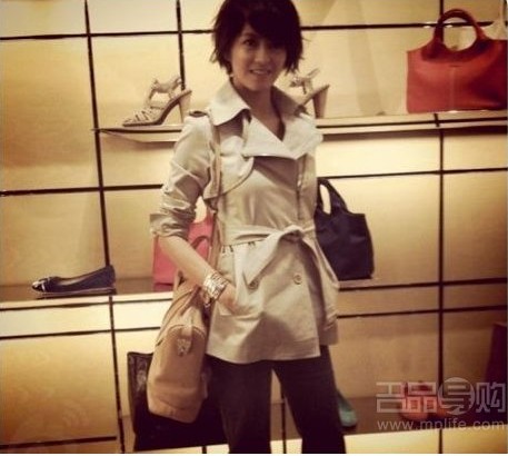 米色干练风衣搭配黑色裤装最适合梁咏琪这种干练的女生,搭配上同样米色系的超大单肩背包非常实用。