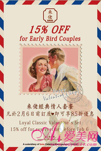 现凡于2月6日前预订情人节晚餐,可享85折优惠。