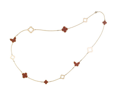 Van Cleef & Arpels梵克雅宝中国专属款Alhambra红玉髓粉金长项链,仅限量发售100件,将Vintage Alhambra和ByZAntine Alhambra图案与蝴蝶设计完美结合。搭配Charming Sweet Alhambra红玉髓粉金耳钉可谓相得益彰。