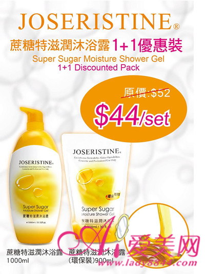 现凡惠顾JOSERISTINE蔗糖特滋润沐浴露1+1优惠装只需$44(原价$52)。