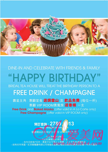 · 惠顾红茶馆VIP贵宾厅,可获赠香槟1支。