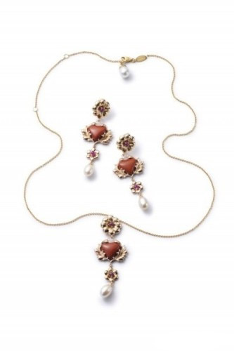 除了精巧细致的小花朵以外,心形造型的宝石镶嵌打造出匠心独具的项链、耳环和各种艺术品级单品。