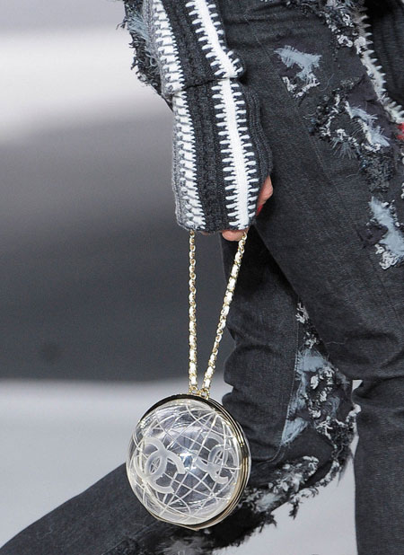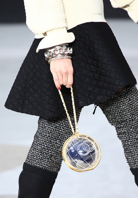 一向以优雅高贵为传统的CHANEL,在老佛爷Karl Lagerfeld的设计之下也变得很玩乐,除了早前呼啦圈手袋之外,老佛爷还模仿LEGO乐高组件,设计了几个塑料块模样的Clutch手包和链带包。而2013秋冬最新秀场更是围绕地球主题,地球仪形状的双C是老佛爷的新创意。