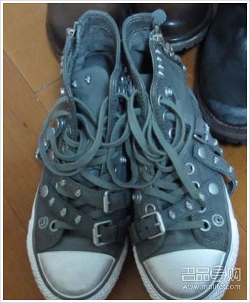 这边大力介绍一下ASH的鞋子,这次的仿旧黑色款里面有小骷髅的图案很朋克哦,外面也都是骷髅噢,这个其实是鞋带+扣的,而且这些骷髅扣都是可以多变组合的。以前一直以为杭州没有,买了后才知道今年刚开专柜,可是基本每双都要一千多,我这双还好折合人民币1030左右,后再在Pedder Red鞋店看到一双带链条的ASH打折后才800港币。