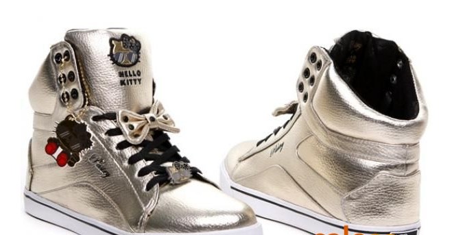 Pastry 成立初期以粉色系为主,颜色配搭犹如甜美的糕点,鞋履亦以甜品名为名,可惜一直未能大红大紫。近日一洗稚气,与万人迷Hello Kitty 合作出金属色系波鞋。Kitty 架上一副机师镜,可爱的红色蝴蝶结亦镶满锅钉,手执一个cupcake,化身成为反叛街童。
