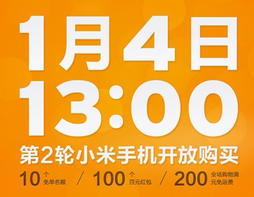 由于一月份有影响产量的元旦、春节这样的节假日,工厂的工人也会放假,我们在质量维稳的情况下加班加点进行生产,所以2012年1月4日13:00将发售10万台小米手机,本次开放销售每人仅限购买一台手机,同步发售的的还有原厂电池(LG电芯)、座充两种新配件,另外也会推出少量的F码给版主、顾问团、资源组、同城会群主、热心米粉等,大家可以邀请亲朋好友来购买小米手机。