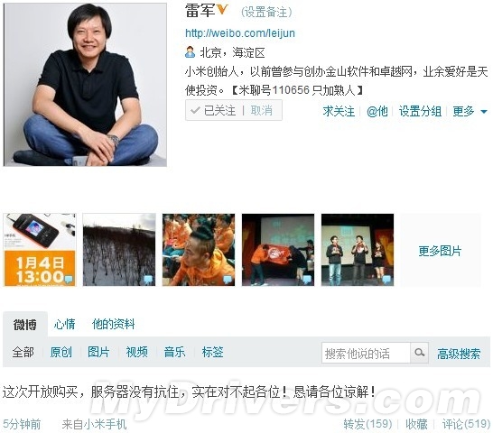 对于小米官网服务器被挤爆情况,雷军在微博上表示称,这次开放购买,服务器没有抗住,实在对不起各位!恳请各位谅解!