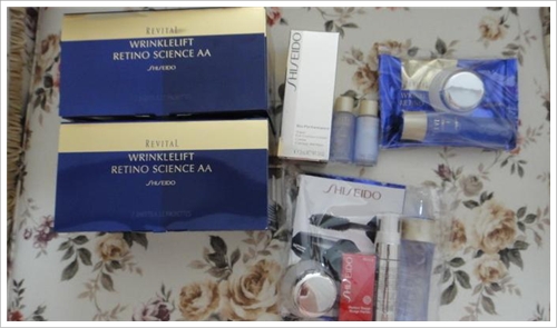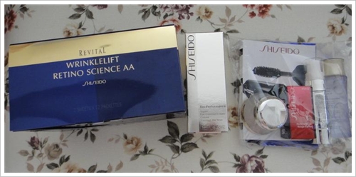 这次去香港打算买眼膜的。正好资生堂在FACES门口做推广活动~很划算呢~~又收了2套眼膜。。其中一盒是买的眼膜套装。另外一个是原价买的,然后加价390买了一瓶眼霜。。送了六件套(睫毛膏,口红,乳液,霜。还有爽肤水)。。还不错的。。有个首饰盒忘记拍了