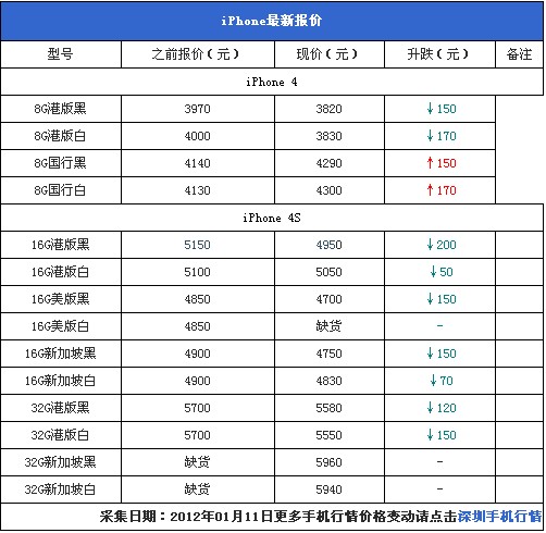 受到行货即将上市的消息影响,港行水货的市场价格全面下降,只有行货的iPhone4略有升价。港行黑色iPhone4S首破5000元!