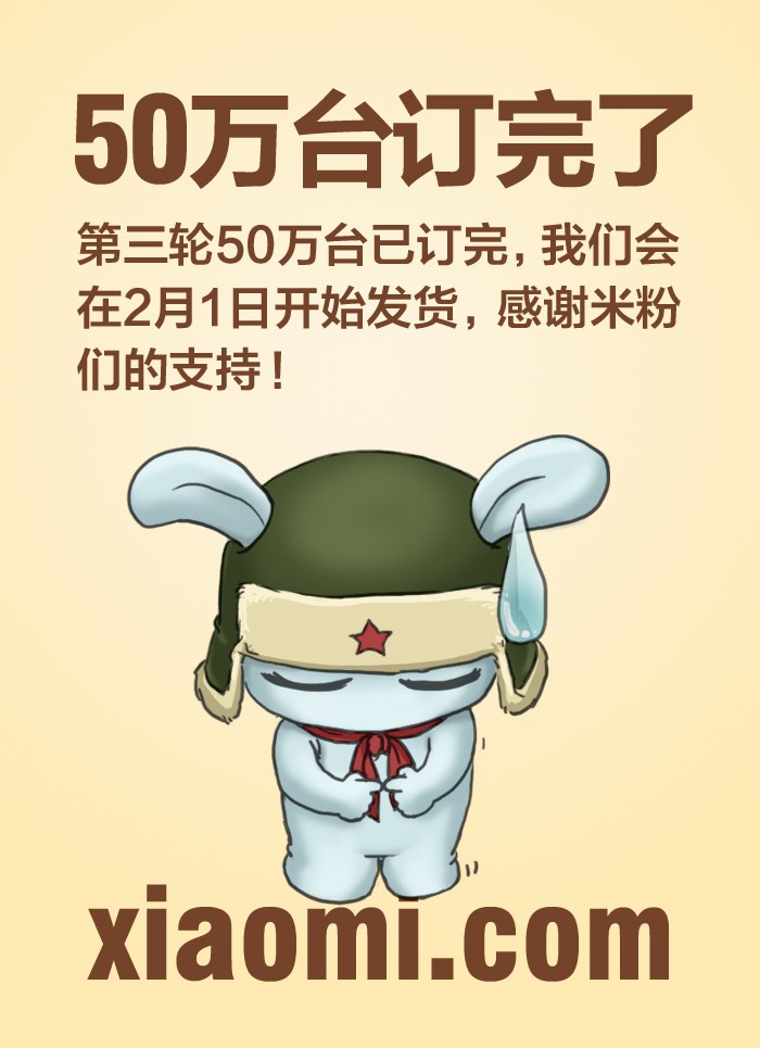 1 月13日凌晨消息,小米手机11日开放第三轮购买,自2012年1月11日12:50到1月12日23:00,50万手机全部预订完毕。昨日晚间官方微博正式宣布50万台已售罄,官网停止预订,并将于2月1日开始发货。第三轮50万台开放预订已经停止。