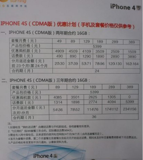 根据曝光的iPhone 4S套餐合约计划来看,电信版iPhone 4S 16GB的合约计划
