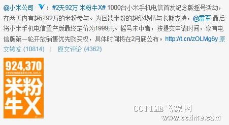 2月20日消息,昨日小米官方发出公告称,电信纪念版小米手机的抢购活动已经结束,总共有924370人参与了这个活动。