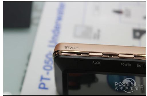 三星ST700采用了钢琴漆涂装的前面板,机身材质为黑色的工程塑料,表面经过钢琴烤漆工艺处理,机身质地十分均匀,面板非常简洁干净,没有多余的装饰。机身右侧同样配备了防滑塑料条,边角略呈一定的弧度,增强了手持的舒适度。