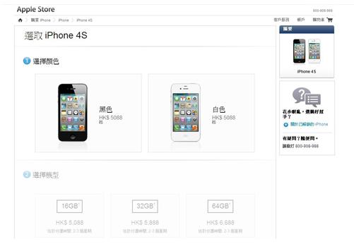 苹果香港官网iPhone 4s开始放货,售价5088港币,折合人民币为4150元。据悉,黑白两色均有货,不同机型的售价分别为:16GB版本iPhone 4s售价5088港币;32GB版本iPhone 4s售价5888港币;64GB版本iPhone 4s售价6688港币。