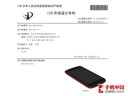 在国家知识产权局的专利检索中,我们发现了小米科技这款正在申请外观设计专利的手机,其名称为MI-Two,从型号来看这应该就是小米手机的第二代产品。其申请日期是2011年09月14日,公开日期为2012年02月15日。设计人则是小米联合创始人之一、负责硬件工业设计业务的副总裁刘德,以及资深产品设计师李昆。