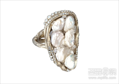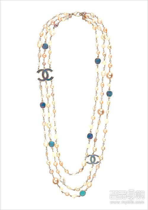 香奈儿 CHANEL 2012春夏珠宝配饰仿佛带我们沉入梦幻的海底深处,大量的珍珠、珐琅以及珊瑚等材质以流畅自然的形态展现在面前。温润的珍珠缠绕在颈间,蜿蜒于背后,闪烁于发丝间,或者作为钮扣或链条腰带装饰,成为本系列的一大亮点,展现出女性的极致柔美。