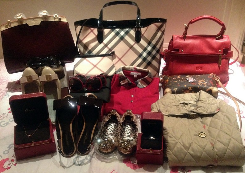 香港归来,卡地亚项链、戒指,LV漆皮包、凉鞋、BURBERRY包、衣服,GUCCI眼镜……